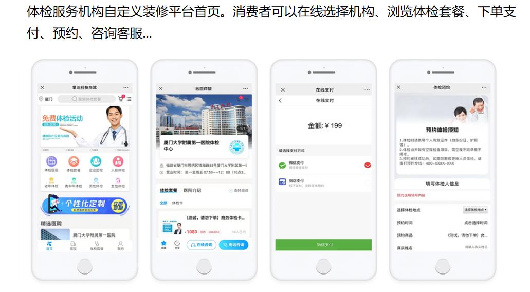 系統(tǒng)包含“城市&醫(yī)院”定位、檢前咨詢、機構(gòu)查詢、健康問卷、私人定制套餐、套餐下單支付、個檢預約/團檢預約、核銷、檢后健康管理、分銷、渠道管理、營銷活動“等功能,體檢服務機構(gòu)可以利用脈購系統(tǒng)通過線上網(wǎng)絡營銷以及渠道合作的方式展開推廣。